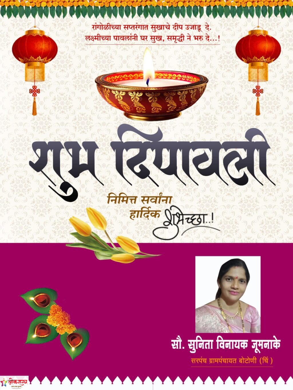 आपला परीसर मारेगाव दिवाळी निमित्त हार्दिक शुभेच्छा…! संपादक : मोरेश्वर त्रिवेणी मारोतराव ठाकरे November 2, 2024 1 min read नवा सुगंध नवा ध्यास, नव्या रांगोळीची नवी आरास, स्वप्नातले रंग नवे,आकाशातले असंख्य दिवे…! दिवाळी निमित्त हार्दिक शुभेच्छा…! शुभेच्छुक – सुनिता विनायक जुमनाके सरपंच ग्रामपंचायत,बोटोनी.(चि.) Post Views: 150 Tags: botoni diwali Continue Reading Previous: कलावंत न्याय हक्क समितीच्या मारेगाव तालूका अध्यक्षपदी राजू सिडाम यांची नियूक्तीNext: दिवाळीच्या हार्दिक शुभेच्छा…! Leave a Reply Cancel replyYour email address will not be published. Required fields are marked *Comment * Name * Email * Website Save my name, email, and website in this browser for the next time I comment. Related Stories जिल्हास्तरीय विज्ञान प्रदर्शनात…बाबासाहेब देशमुख विद्यालय पहापळ चा सलग दुसऱ्या वर्षी राज्यस्तरीय झेंडा…! 1 min read आपला परीसर जिल्हास्तरीय विज्ञान प्रदर्शनात…बाबासाहेब देशमुख विद्यालय पहापळ चा सलग दुसऱ्या वर्षी राज्यस्तरीय झेंडा…! January 12, 2026 सुखद…दोन जीवांचे झाले पुनर्मिलन…! 1 min read मारेगाव सुखद…दोन जीवांचे झाले पुनर्मिलन…! December 14, 2025 पक्षविरोधी कारवायांमुळे शिवसेनेतील(शिंदे) दोन पदाधिकाऱ्यांची हकालपट्टी 1 min read मारेगाव पक्षविरोधी कारवायांमुळे शिवसेनेतील(शिंदे) दोन पदाधिकाऱ्यांची हकालपट्टी December 13, 2025