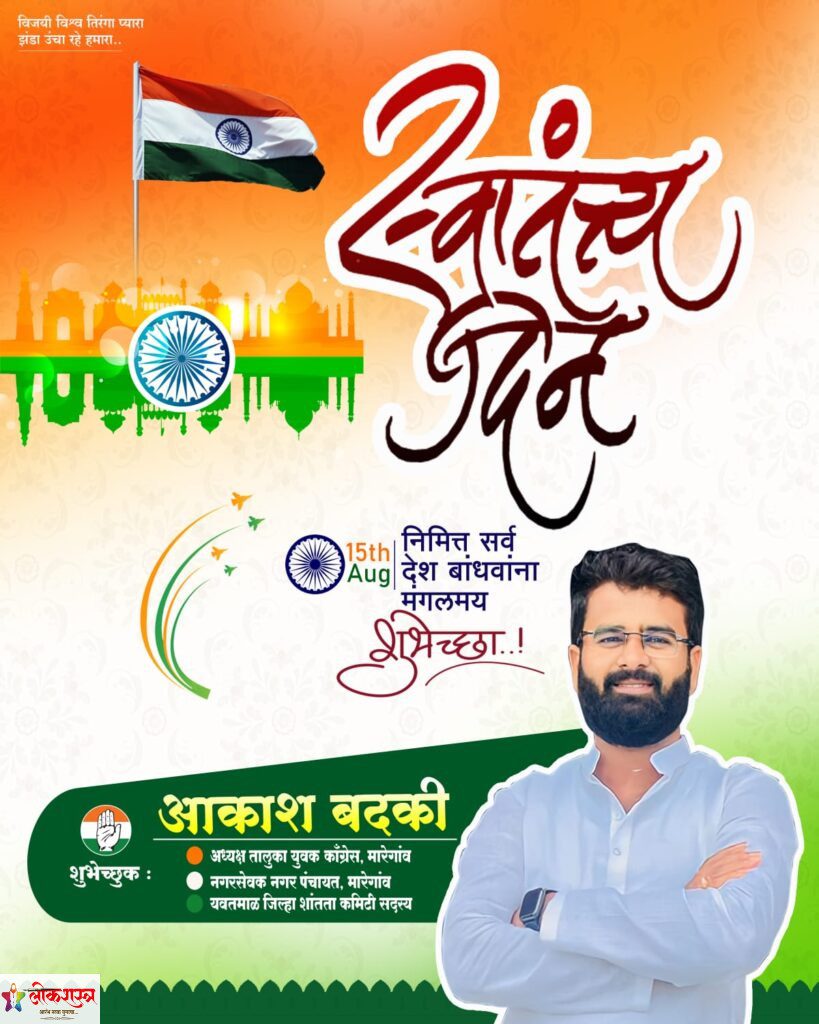 मारेगाव स्वातंत्र्य दिनाच्या हार्दिक शुभेच्छा…! संपादक : मोरेश्वर त्रिवेणी मारोतराव ठाकरे August 14, 2024 1 min read देशाला मिळालं स्वातंत्र्य मार्गात आलेल्या प्रत्येक संकटाला टाळून, चला पुन्हा उधळूया रंग आणि जगूया देशाच्या स्वातंत्र्याचा हा सण…वंदे मातरम्. स्वातंत्र्य दिनाच्या हार्दिक शुभेच्छा…! शुभेच्छुक — श्री.आकाश बदकी अध्यक्ष-तालुका युवक काँग्रेस, मारेगाव. नगरसेवक-नगरपंचायत मारेगाव. यवतमाळ जिल्हा शांतता कमिटी सदस्य. Post Views: 143 Tags: Greetings Indipendance day Continue Reading Previous: स्वातंत्र्य दिनाच्या हार्दिक शुभेच्छा…!Next: स्वातंत्र्य दिनाच्या हार्दिक शुभेच्छा…! Leave a Reply Cancel replyYour email address will not be published. Required fields are marked *Comment * Name * Email * Website Save my name, email, and website in this browser for the next time I comment. Related Stories सुखद…दोन जीवांचे झाले पुनर्मिलन…! 1 min read मारेगाव सुखद…दोन जीवांचे झाले पुनर्मिलन…! December 14, 2025 पक्षविरोधी कारवायांमुळे शिवसेनेतील(शिंदे) दोन पदाधिकाऱ्यांची हकालपट्टी 1 min read मारेगाव पक्षविरोधी कारवायांमुळे शिवसेनेतील(शिंदे) दोन पदाधिकाऱ्यांची हकालपट्टी December 13, 2025 दिपावलीच्या मनःपूर्वक शुभेच्छा…! 1 min read आपला परीसर मारेगाव दिपावलीच्या मनःपूर्वक शुभेच्छा…! October 21, 2025