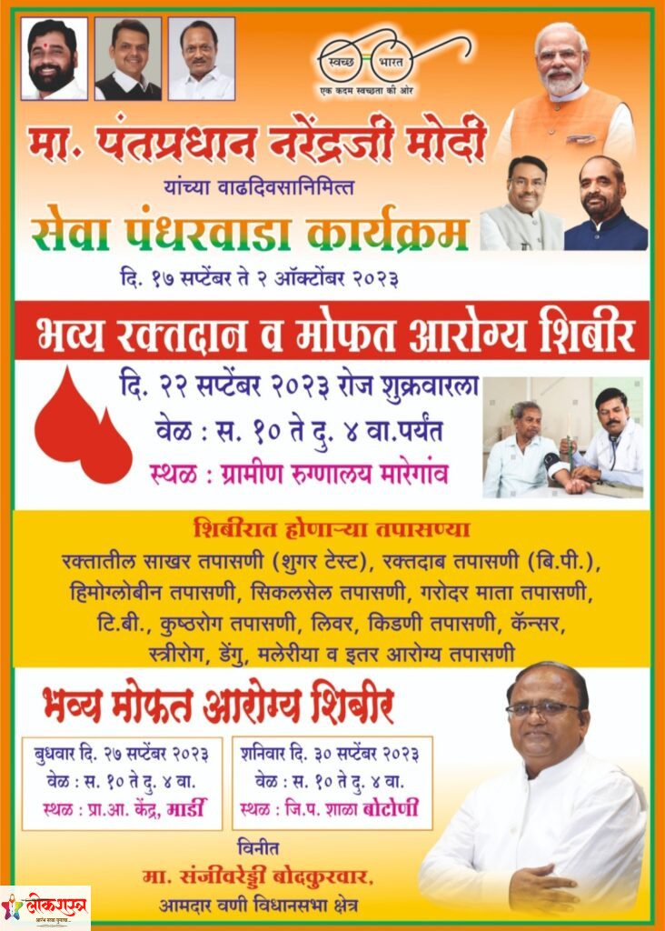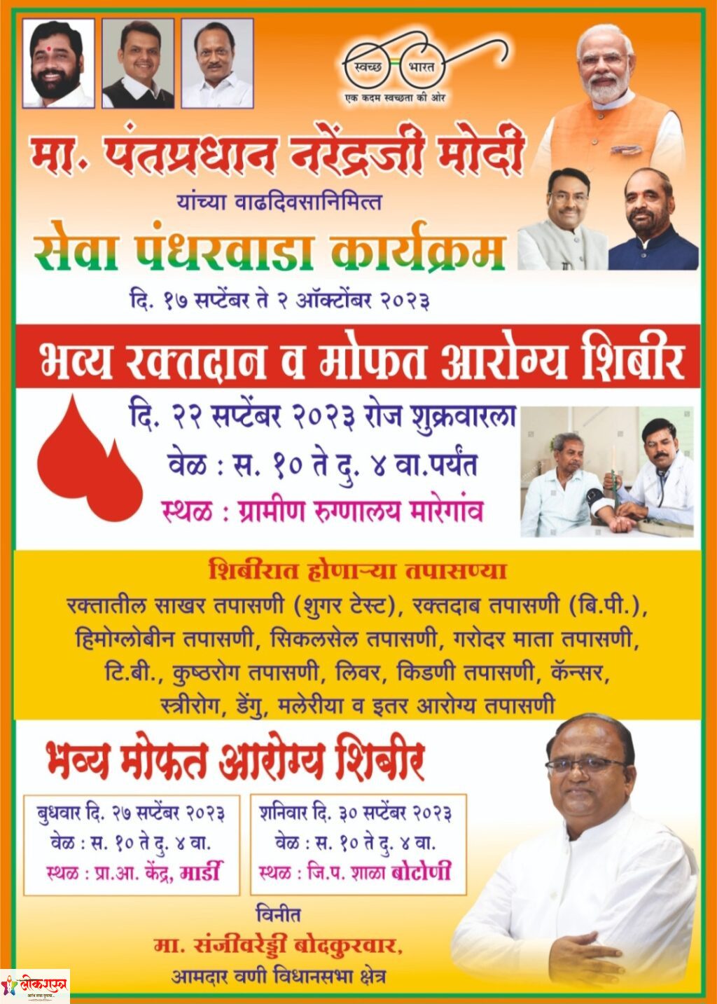 भाजपच्या वतीने ‘राष्ट्रनेता ते राष्ट्रपिता’ या सेवा पंधरवड्या अंतर्गत अवघ्या देशभरात ‘सेवा पंधरवडा’ हा स्तुत्य उपक्रम भारतीय जनता पक्षाचे वतीने आयोजन करण्यात आले आहे.परिणामी भारताचे पंतप्रधान नरेंद्र मोदी यांच्या वाढदिवसानिमित्त मारेगावातील ग्रामीण रुग्णालयात ता.२२ सप्टेंबर रोजी रक्तदान व आरोग्य तपासणी शिबिराचे आयोजन करण्यात आले. गरजुंनी या शिबिराचा लाभ घेण्याचे आवाहन आयोजकांनी केले आहे.